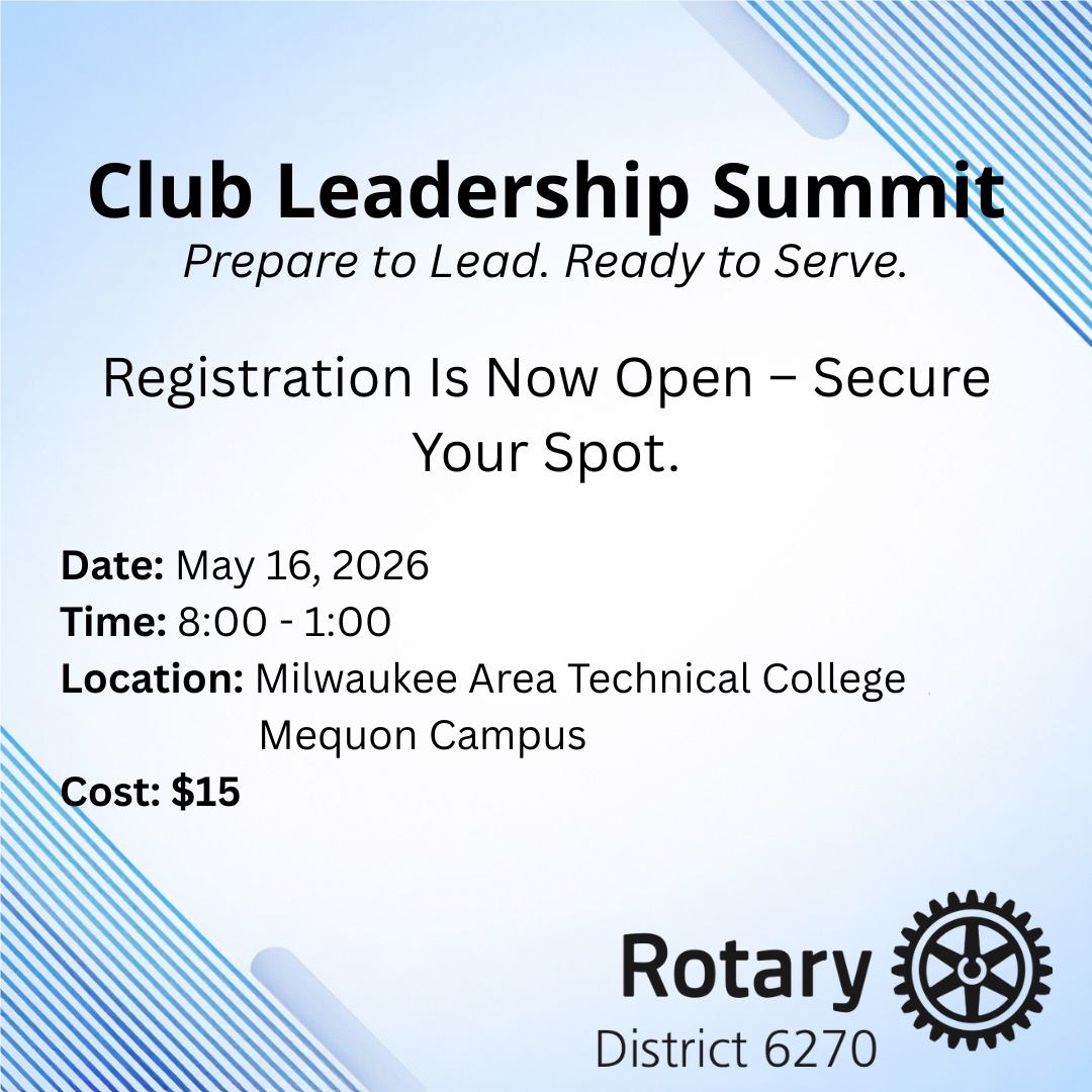 On Saturday, May 16, 2026, members of Rotary from across southeastern Wisconsin will gather at the Milwaukee Area Technical College | Mequon Campus for the Club Leadership Summit, a focused learning event for the 2026–27 Rotary year.